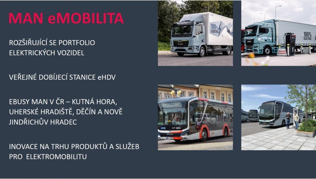 V roce 2025 začala e-mobilita v podání MAN reálně měnit tvář české dopravy. Na české silnice vyrazily první dva exempláře nové generace plně elektrických tahačů MAN eTGX pro dálkovou bezemisní přepravu. V segment Bus MAN potvrdil roli lídra v městské mobilitě dodáním 14 plně městských autobusů MAN Lion's City s akumulátory, jež zajišťují čistou přepravu cestujících v Kutné Hoře a v Uherském Hradišti. V blízké době se jejich flotila rozšíří také o nasazení v Jindřichově Hradci.