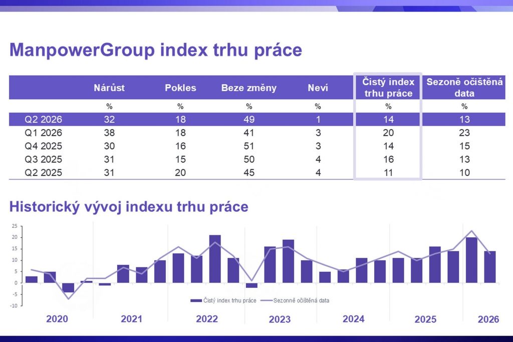 Společnost ManpowerGroup Česká republika zveřejnila výsledky průzkumu ManpowerGroup index trhu práce pro druhé čtvrtletí roku 2026. Data ukazují, že český pracovní trh zůstává stabilní, avšak dochází k výraznějším výkyvům mezi jednotlivými odvětvími i velikostmi firem.