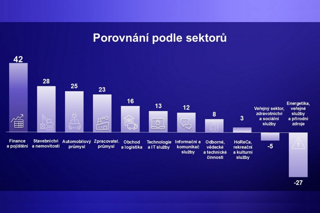 Ve druhém čtvrtletí se rozdíly mezi sektory výrazně prohloubily. Zatímco Finanční sektor a Výroba zrychlují nábory, Energetika a přírodní zdroje nebo Veřejný sektor se propadají do pesimismu. Nejvyšší náborový optimismus vykazuje sektor Finance a pojišťovnictví s Čistým indexem 42 bodů. Tento sektor patří několik čtvrtletí mezi nejpozitivnější.