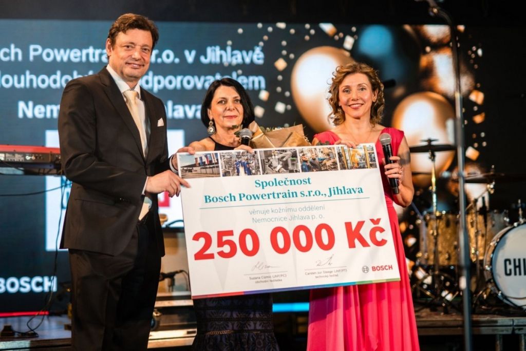 Bosch Jihlava dlouhodobě podporuje místní region a pravidelně pomáhá organizacím ve zdravotnictví a sociální oblasti. Letos na plese jihlavský Bosch věnoval Nemocnici Jihlava finanční dar ve výši 250 000 korun. Dar bude využit na modernizaci lymfologického pracoviště kožního oddělení, konkrétně na instalaci nové ventilace se vzduchotechnikou. Symbolický šek předali primářce kožního oddělení Marii Policarové obchodní ředitelka společnosti Suzana Cizmic společně s technickým ředitelem Carstenem zur Steege.